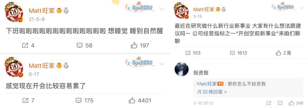 同樣活躍在沖浪一線的二代老板,還有 “Matt旺家”。有多少人跟小編一樣都以為這個(gè)名字是旺旺的官方賬號(hào)?實(shí)際上,旺家就是旺旺二公子的本名,這個(gè)賬號(hào)也是二公子個(gè)人運(yùn)營(yíng)的。他不僅天天在微博和旺旺官博互動(dòng),還常常一線沖浪吃瓜。而且,更“人設(shè)崩塌”的是,這位二公子走的居然是搞笑男路線。