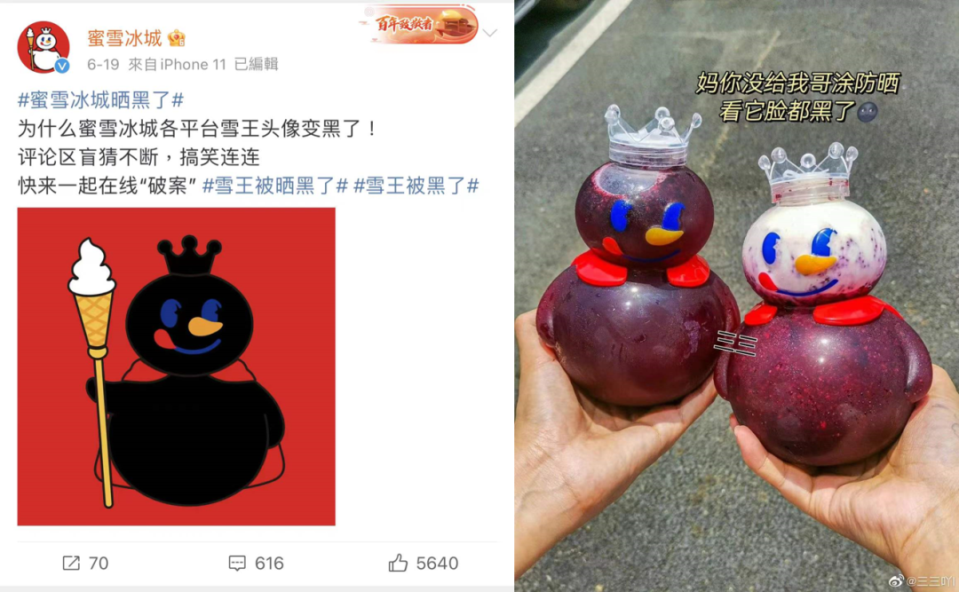 而“雪王”的形象作為蜜雪冰城的官方門面,前不久還全網(wǎng)推出了“黑化版”,不僅外賣平臺(tái)上的門店logo物理性上的“變黑”,線下門店還推出了黑色的雪王人偶,這樣具有極大反差的營(yíng)銷迅速吸引了廣大網(wǎng)友的注意,提高了品牌的關(guān)注度,在大家紛紛猜測(cè)是不是連續(xù)高溫給雪王曬黑之時(shí),順利地推出了新品桑葚果茶。