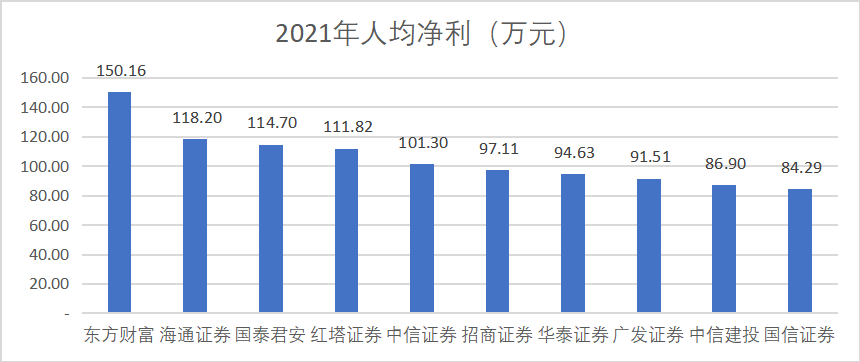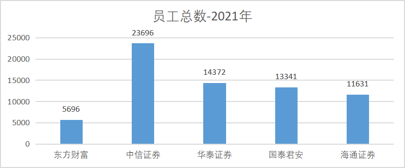 因為平臺效應省去了很多地推和銷售的人員成本,導致東方財富的人均盈利能力非常強。從企業(yè)披露的員工數(shù)也可以看出,東財在利用互聯(lián)網(wǎng)流量優(yōu)勢保持高增速的同時,人員數(shù)僅為頭部券商的一半以內。