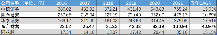 我們統(tǒng)計了券商TOP3(凈利規(guī)模)和“老對手”同花順,自16年以來的增長,東方財富的五年CAGR達到了40.97%,遠高于同行,21年營收同比增速達到了58.93%。