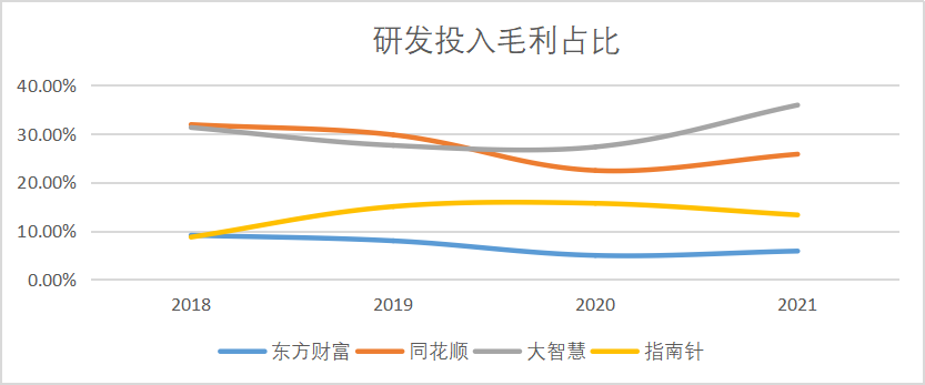 東方財富董事長沈軍在電話會中明確表示:“我們是有牌照的技術企業(yè)”,并且在多個場合都宣稱東方財富是互聯(lián)網(wǎng)公司。但是我們對比同行業(yè)的財經(jīng)門戶軟件公司發(fā)現(xiàn),東方財富在研發(fā)投入上好像不是那么愿意花錢。2021年報顯示東方財富研發(fā)投入占毛利比僅為5.82%,而體量更小的同花順占比達到了25.8%,剛剛取得網(wǎng)信證券牌照的“小東財”指南針,研發(fā)投入占比也達到了13.28%。
