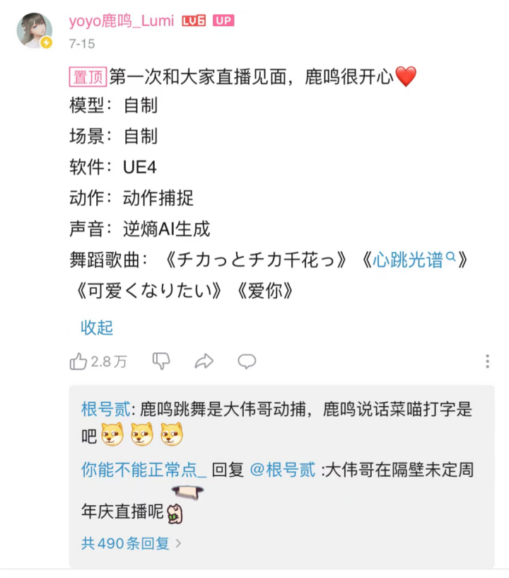 對于鹿鳴背后的技術(shù),是否存在專業(yè)動捕技術(shù)員、聲音來源、性格來源等與“中之人”相掛鉤的元素加持,官方都尚未蓋棺定論。有人認(rèn)為鹿鳴還是有“中之人”的,負(fù)責(zé)諸如閱讀觀眾的評論和彈幕,并操控鹿鳴給予實時的反饋;有人抓住鹿鳴聲音由逆熵AI生成的聲明,認(rèn)為鹿鳴的直播表現(xiàn)也是AI模擬的人類情感,其中包含著AI的算法和學(xué)習(xí)技術(shù),是一種高水準(zhǔn)的人工智能。