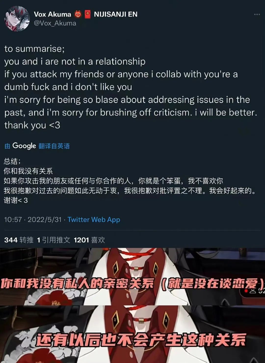 Vox當(dāng)晚并未在直播中對此突發(fā)事件進(jìn)行回應(yīng),而是等到了深夜在Twitter發(fā)布了文字回應(yīng)和直播預(yù)告,在直播中,他聲明自己以來對粉絲的男友向互動都只是營業(yè)需要,“你(所有的粉絲)和我(Vox)都不是親密關(guān)系(relationship)”。