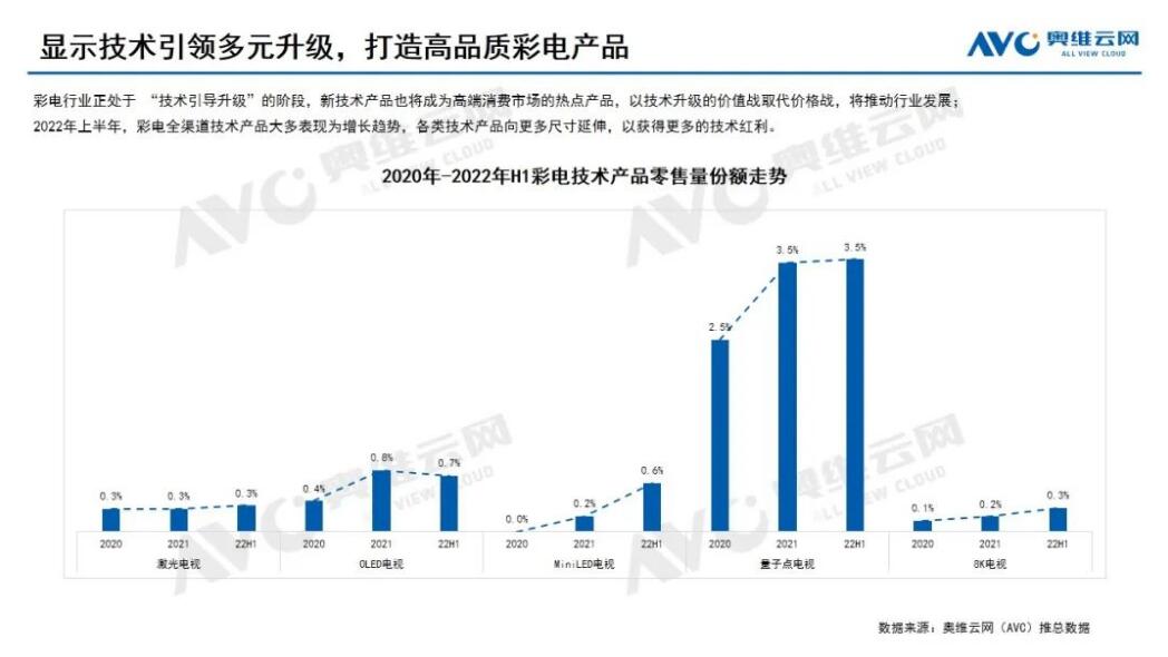 奧維云網(wǎng)數(shù)據(jù)顯示:上半年OLED、激光電視、miniLED、8K這四類(lèi)高端技術(shù)的產(chǎn)品,在市場(chǎng)端呈現(xiàn)出不同的態(tài)勢(shì)。其中OLED電視有點(diǎn)失望、miniLED增勢(shì)迅猛、8K表現(xiàn)也有驚喜、激光電視則相對(duì)沉穩(wěn)。