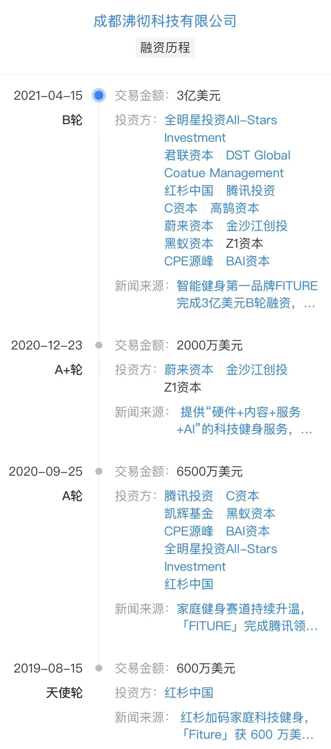 時隔一年之后,2020年9月,在FITURE同名初代產(chǎn)品面世前的一個月,公司就又宣布完成A輪6500萬美元融資,刷新了全球健身行業(yè)A輪融資的紀錄,由騰訊領投,C資本、凱輝基金、黑蟻資本、CPE、BAI、全明星基金跟投,參與了FITURE天使輪融資的紅杉資本也再次加碼。