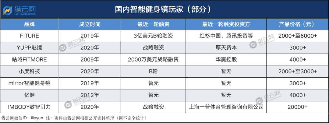 截至今日,智能健身鏡賽道已呈現(xiàn)三分天下的態(tài)勢:以FITURE、Mirror、myShape、YUPP等為代表的初創(chuàng)公司,以樂刻、咕咚、小喬體育等為代表的健身行業(yè)資深玩家,還有以百度、小米、華為為代表的科技巨頭。天眼查數(shù)據(jù)顯示,智能健身鏡領域已有10余家企業(yè)產(chǎn)生超20起融資,最新一起融資為今年7月YUPP完成以小米生態(tài)鏈谷倉學院背景的厚天資本參與的戰(zhàn)略投資。