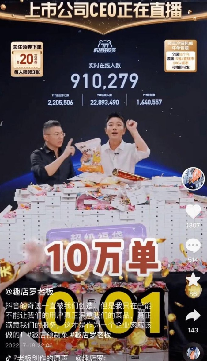 “虧錢就是讓大家在這個(gè)過(guò)程中能夠去品嘗我們的預(yù)制菜?!绷_敏現(xiàn)場(chǎng)算了一筆賬,按照每份商品19.9元的價(jià)格來(lái)算,加上冷鏈配送的快遞費(fèi),每售出一份商品,趣店要虧十幾塊錢。