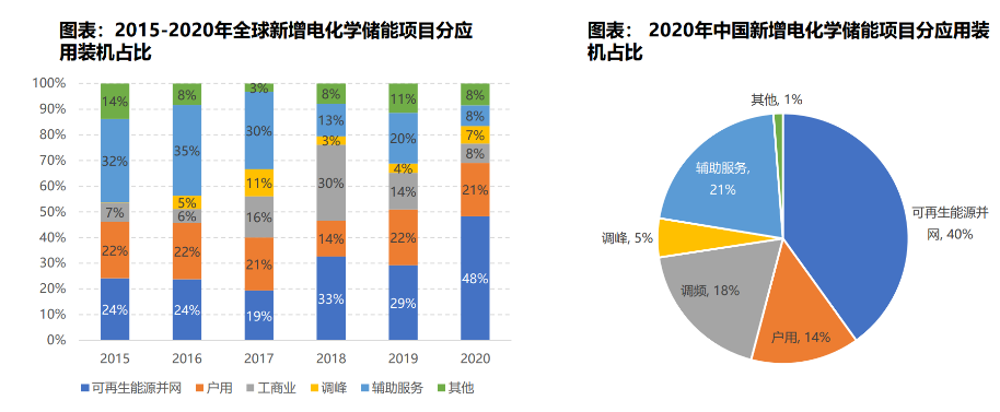 而根據(jù)BNEF數(shù)據(jù),2020年全球新增的電化學(xué)儲(chǔ)能主要應(yīng)用于可再生能源并網(wǎng),全球裝機(jī)占比達(dá)48%。從國(guó)內(nèi)角度看,2020年國(guó)內(nèi)新增電化學(xué)儲(chǔ)能用于可再生能源并網(wǎng)裝機(jī)占比也達(dá)到40%。可再生能源的快速發(fā)展為電化學(xué)儲(chǔ)能的擴(kuò)張?zhí)峁┝酥饕獎(jiǎng)恿?。此外,電化學(xué)儲(chǔ)能在調(diào)頻調(diào)峰及輔助服務(wù)中廣泛應(yīng)用。