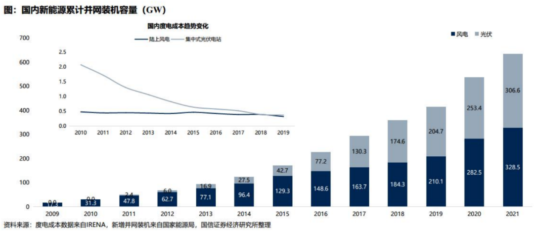 國(guó)家能源局?jǐn)?shù)據(jù)顯示,風(fēng)電并網(wǎng)裝機(jī)容量在近幾年大幅度提升,光伏并網(wǎng)裝機(jī)容量在2015-2019年增長(zhǎng)趨緩后再次爆發(fā),2021年較2019年多出56.35%,至2021年末,光伏與風(fēng)電并網(wǎng)裝機(jī)容量達(dá)到635.1GW。根據(jù)IRENA數(shù)據(jù)顯示,我國(guó)風(fēng)、光電成本也在大幅下降,目前已經(jīng)接近甚至低于火電度電成本(約0.2元-0.3元,隨煤價(jià)波動(dòng))。