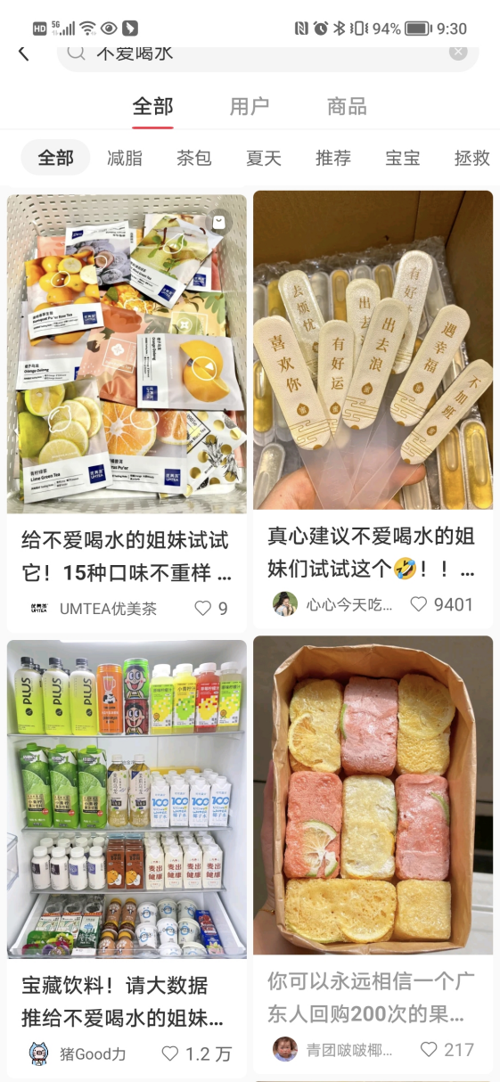 我們從小紅書、微博等社交平臺上發(fā)現(xiàn),在網(wǎng)友的冰箱或水杯里,出鏡率較高的品類集中在近水飲料、袋泡或即飲茶等。