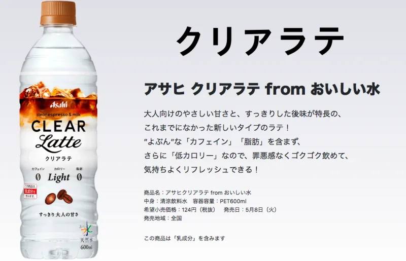 Asahi在日本推出的一款透明拿鐵更是在剛上架時被一掃而空,這款產(chǎn)品用“黑科技”去除了咖啡顏色和苦味,只留下咖啡香氣和味道,而且0咖啡因、0脂肪、低卡路里。