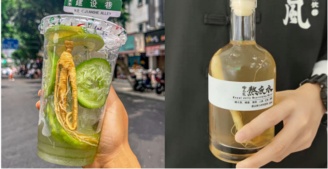 荷田水鋪也曾推出“熬夜人參水”,長(zhǎng)沙行茶令也推出一整根人參飲品,果瘋了“人參爆爆檸”也有一整根人參……
