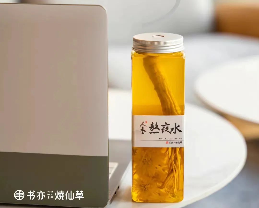 今年年初,書(shū)亦燒仙草也在部分門(mén)店推出人參熬夜水,一整根長(zhǎng)白山人參,配上黃山菊花、蜂蜜和烏龍茶,中和了人參的藥味,入口有回甘的清甜,在社交媒體上被很多人種草。