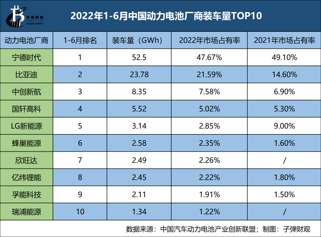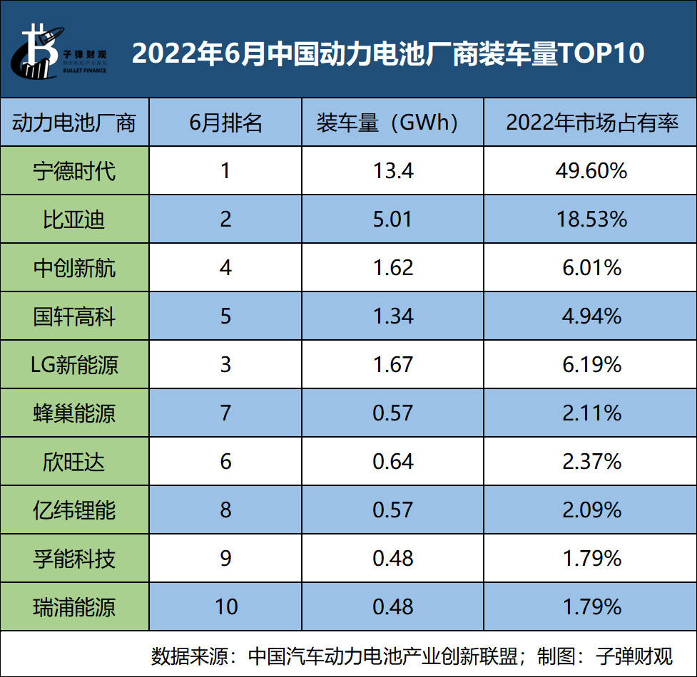 7月11日,中國汽車動力電池產(chǎn)業(yè)創(chuàng)新聯(lián)盟公布了6月動力電池裝車量數(shù)據(jù):中國動力電池裝車量為27.0GWh,同比增長143.3%,其中寧德時(shí)代以13.40GWh的裝車量位列第一名,其市場占有率為49.60%,而比亞迪、LG新能源、中創(chuàng)新航和國軒高科位列第二至五名。