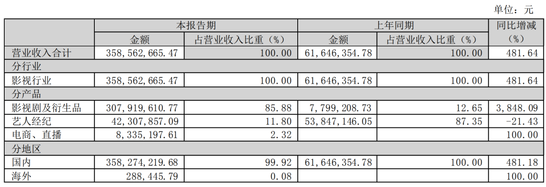從財報披露的內(nèi)容來看,歡瑞世紀年中業(yè)績大幅增長,主要是受影視劇銷售收入大幅增長的影響。報告期內(nèi),公司來自影視劇及衍生品的收入達到3.08億,占總營收的85.88%,較上年同期暴增3848.09%。