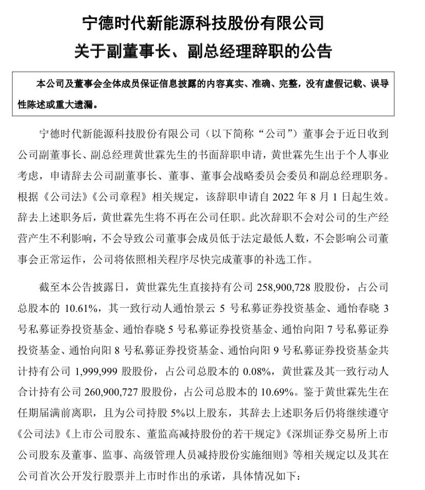 周佳接任副董事長職位后即意味著他不再負責公司具體業(yè)務的管理工作,由公司創(chuàng)始人曾毓群接過帥印,將董事長、總經(jīng)理兩大職務內外一肩挑,而寧德時代二當家黃世霖這次的辭職近乎于“裸辭”。