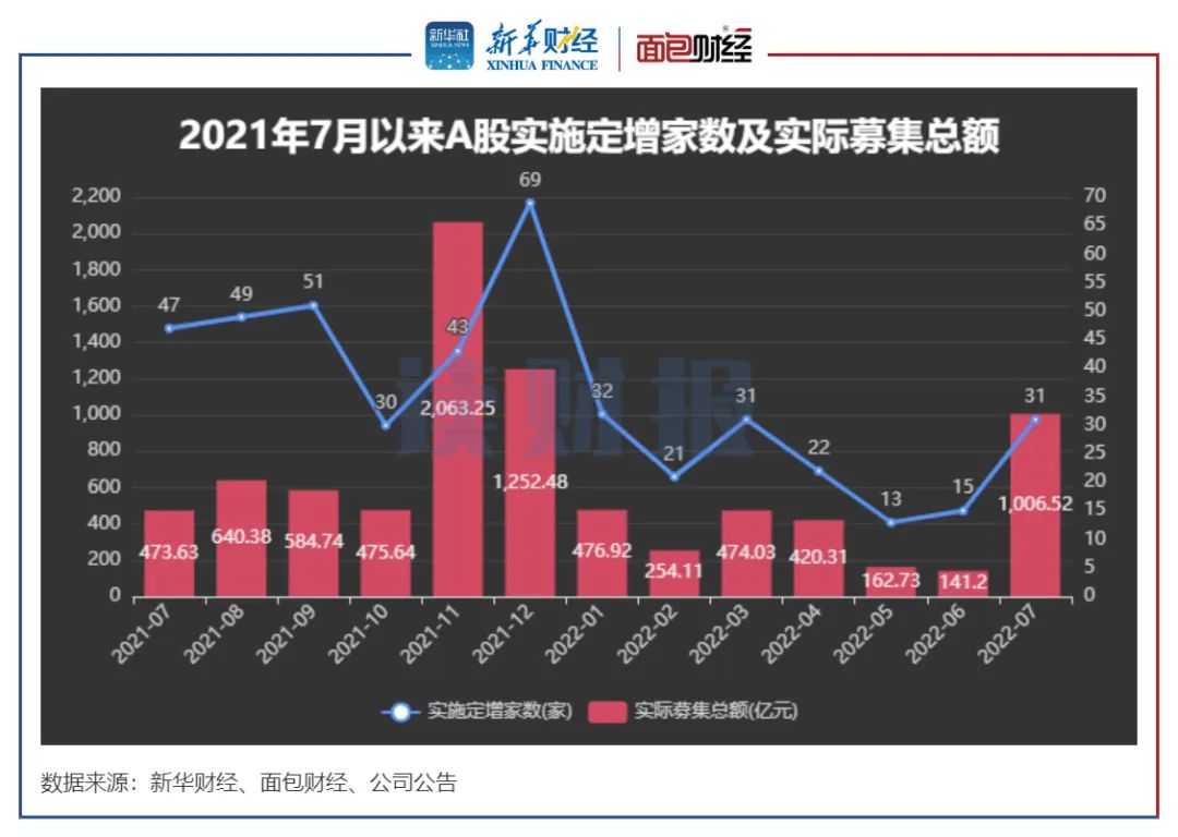 統(tǒng)計(jì)顯示,2022年7月,A股上市公司共計(jì)實(shí)施定增31起,實(shí)際募資總額約1006.52億元,定增實(shí)施家數(shù)及募集資金較上月均有明顯上升,較上年同期相比,定增實(shí)施家數(shù)雖有下降,但實(shí)際募集資金增長(zhǎng)明顯。