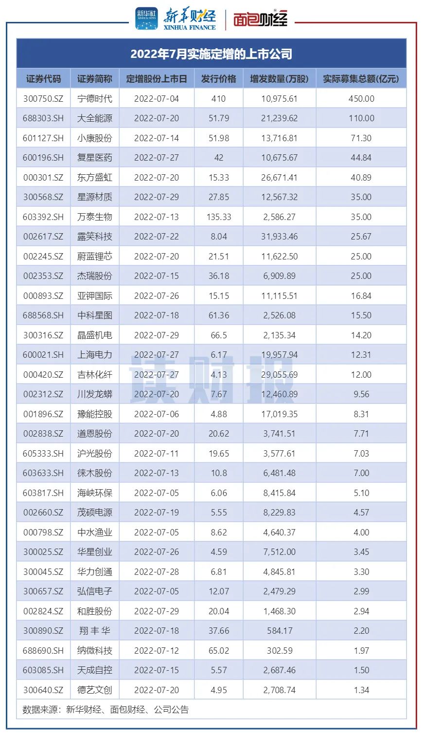 2022年7月實(shí)施定增的上市公司中,寧德時(shí)代的實(shí)際募資總額排在首位。寧德時(shí)代共發(fā)行約10975.61萬股,發(fā)行價(jià)格為410元/股,實(shí)際募集資金總額約450億元。發(fā)行對(duì)象包括南方東英資產(chǎn)管理有限公司、溧陽(yáng)市先進(jìn)儲(chǔ)能私募基金合伙企業(yè)(有限合伙)、麥格理銀行有限公司、香港上海匯豐銀行有限公司等22家機(jī)構(gòu)投資者。其募集資金將用于福鼎時(shí)代鋰離子電池生產(chǎn)基地項(xiàng)目、廣東瑞慶時(shí)代鋰離子電池生產(chǎn)項(xiàng)目一期、江蘇時(shí)代動(dòng)力及儲(chǔ)能鋰離子電池研發(fā)與生產(chǎn)項(xiàng)目(四期)、寧德蕉城時(shí)代鋰離子動(dòng)力電池生產(chǎn)基地項(xiàng)目(車?yán)餅稠?xiàng)目)、以及寧德時(shí)代新能源先進(jìn)技術(shù)研發(fā)與應(yīng)用項(xiàng)目。