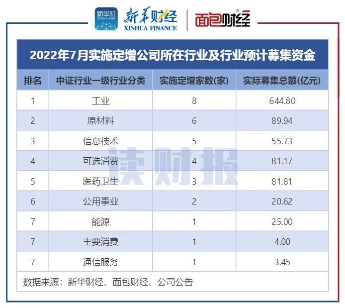 從行業(yè)分布來看,以中證行業(yè)統(tǒng)計(jì),2022年7月,工業(yè)行業(yè)有8家上市公司實(shí)施定增,排在各行業(yè)之首;其次是原材料行業(yè),有6家上市公司實(shí)施定增;信息技術(shù)行業(yè)有5家上市公司實(shí)施定增,排在第三位。