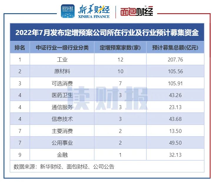 從行業(yè)分布來看,以中證行業(yè)統(tǒng)計(jì),2022年7月,工業(yè)有12家公司發(fā)布定增預(yù)案,數(shù)量排在各行業(yè)之首;原材料行業(yè)排在第二位,有10家公司發(fā)布定增預(yù)案;可選消費(fèi)行業(yè)有7家發(fā)布定增預(yù)案,位列第三位。醫(yī)藥衛(wèi)生、通信服務(wù)和信息技術(shù)行業(yè)均有3家發(fā)布定增預(yù)案。