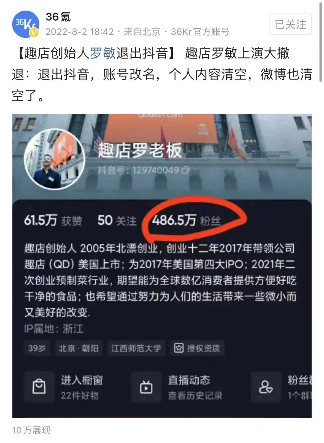 昨晚,趣店羅老板刪除了自己的抖音賬號(hào),486.5萬粉絲瞬間歸零。