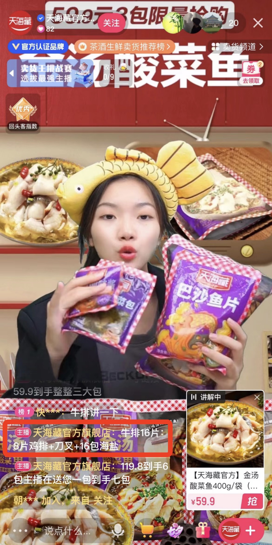 另一方面是品牌矩陣瘋狂帶貨,天海藏旗下有6個(gè)品牌自播矩陣號(hào),官方旗艦店粉絲已達(dá)41萬,月直播銷售額能達(dá)到2000萬。在組品方面,品牌善于多品組合營銷,比如“16片牛排+8片雞排+海鹽刀叉”或者“拍一發(fā)7”。