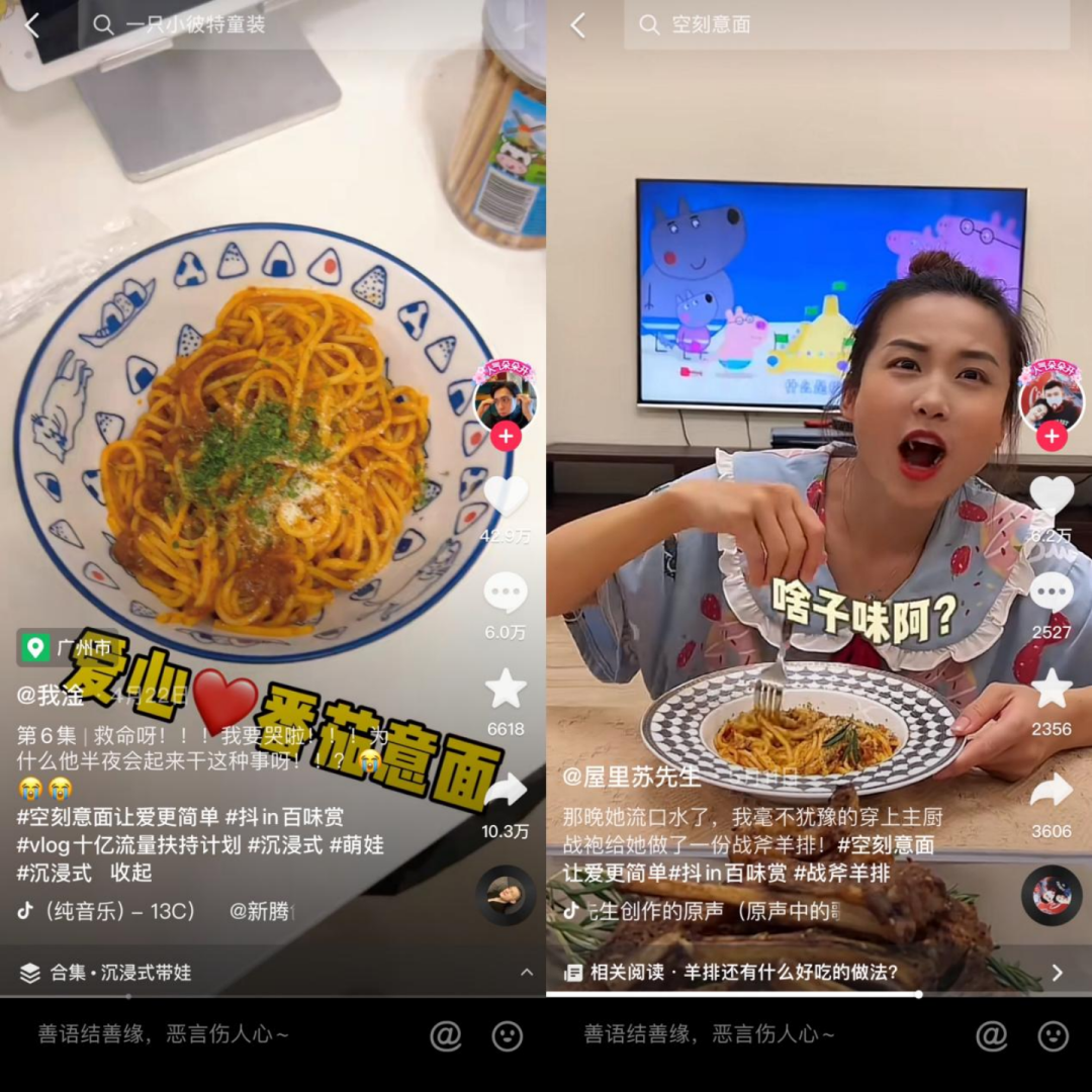 比如,空刻參加抖音電商食品飲料行業(yè)的“抖in百味賞”活動(dòng),會(huì)把消費(fèi)者在做決策時(shí)考慮到的所有因素,作為品牌的傳播點(diǎn),以人物IP、食欲感沖擊、產(chǎn)品或品牌故事等,選擇用戶熟悉的生活場景切入,減輕用戶對(duì)意面品類的陌生感。如將寶寶厭食、親子互動(dòng)等場景內(nèi)容化。