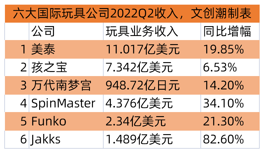 比如美泰、孩之寶、萬代南夢宮、SpinMaster、Funko和Jakks,二季度的玩具業(yè)務(wù)收入都延續(xù)了此前幾個季度的增長態(tài)勢。