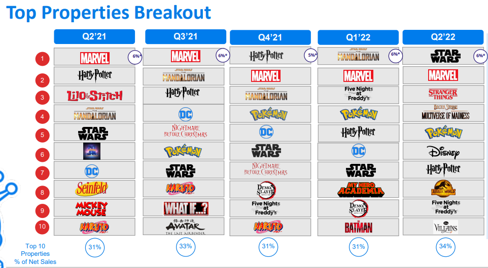IP方面,二季度對Funko收入貢獻(xiàn)最大的前十IP分別為: