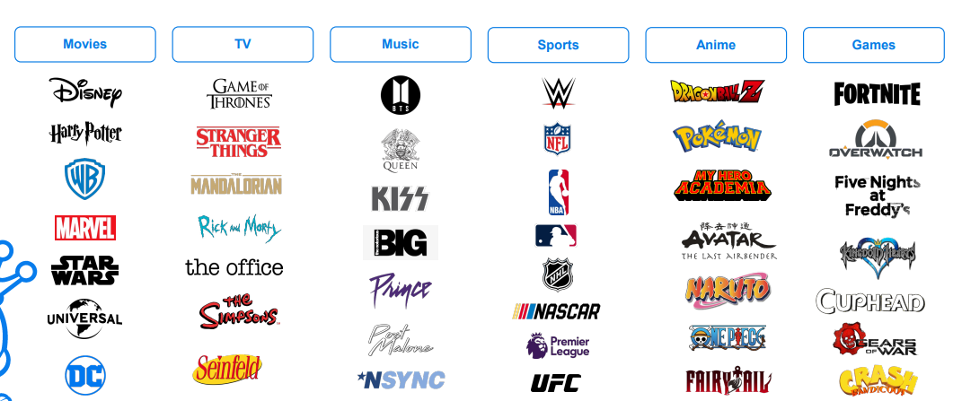 星球大戰(zhàn)、漫威、怪奇物語、奇異博士·瘋狂多元宇宙、寶可夢、迪士尼、哈利波特、侏羅紀(jì)世界、玩具熊的五夜后官、迪士尼反派(Disney Villains)。
