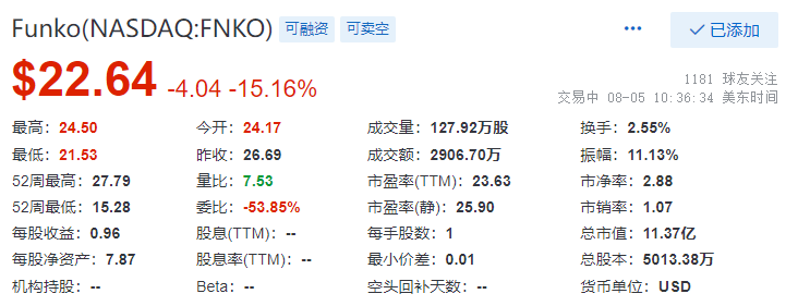 8月5日Funko股價(jià)大跌15%