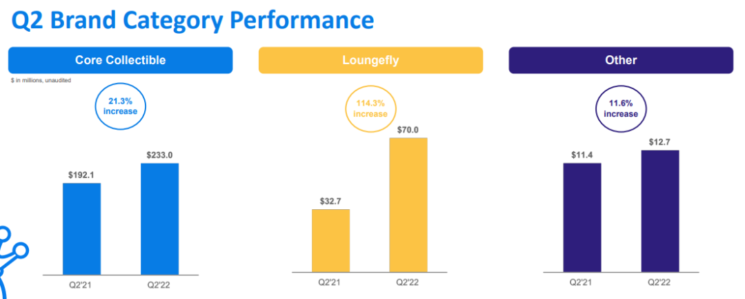 Funko三大業(yè)務(wù),二季度分別同比增長21.3%、114.3%和11.8%。2017年收購來的Loungefly增長表現(xiàn)最突出。