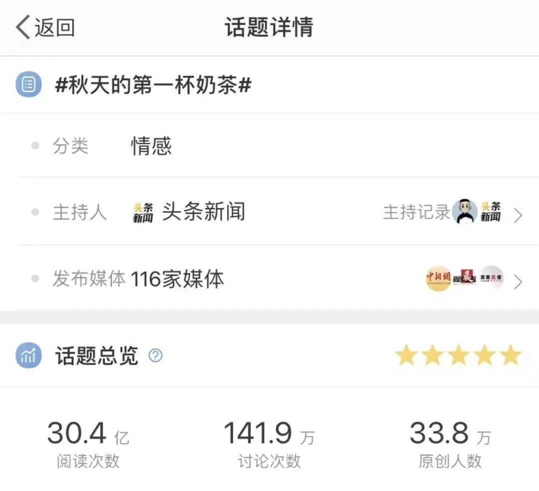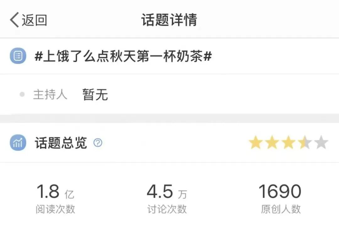 微博熱搜閱讀量破30億,登陸抖音熱榜第6名,小紅書筆記超過12萬篇,朋友圈更是齊刷刷地曬出了“秋天的第一杯奶茶”。