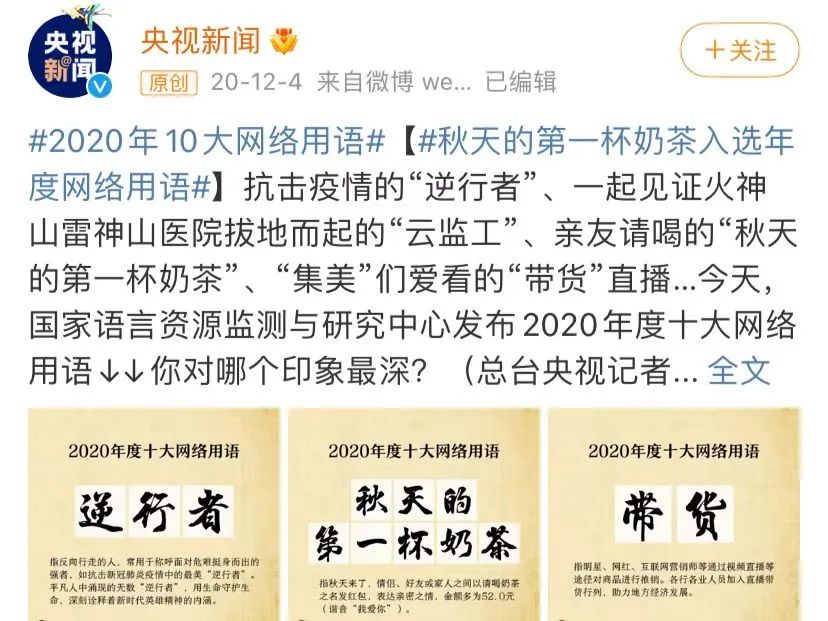 2020年9月,“秋天的第一杯奶茶”是在消費端火起來的,微信、微博、抖音、小紅書上爆紅,掀起了一陣奶茶熱,同年,“秋天第一杯奶茶”入選了10大網(wǎng)絡(luò)用語。