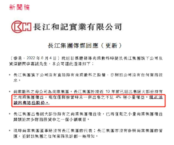 8月4日長江和記發(fā)布公告,先與尚乘數(shù)科劃清界限,公告稱長江集團旗下公司沒有直接持有尚乘數(shù)科之股權,亦與該公司沒有任何業(yè)務往來。現(xiàn)時尚乘集團董事局沒有長江集團的代表;長江集團亦沒有參與尚乘集團的營運,并對該集團之任何業(yè)務及計劃一無所知。然后表明尚乘數(shù)科暴漲對于李嘉誠完全是筆意外之財,長江集團已大約在10年前就已經出售了尚乘數(shù)科母公司尚乘集團大部分股權,目前僅剩不足4%的股權,長江集團把它歸類于小額項目,目前在洽談出售這些股份。