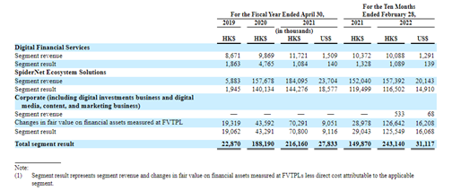 說起業(yè)績,2019年、2020年、2021年,尚乘數(shù)科數(shù)字金融業(yè)務的營收分別為867.1萬港元、986.9萬港元、1172.1萬港元,蜘蛛網生態(tài)系統(tǒng)解決方案為其主要的收入來源,這三年的營收分別為588.3萬港元、1.58億港元、1.84億港元。
