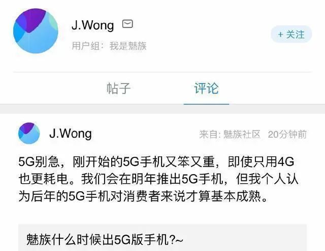 比如,2019年中,有魅友在魅族論壇詢問“魅族什么時候出5G版手機(jī)?”隨后,黃章回復(fù)道:“5G別急,剛開始的5G手機(jī)又笨又重,即使只用4G也更耗電。我們會在明年推出5G手機(jī),但我個人認(rèn)為后年的5G手機(jī)對消費(fèi)者來說才算基本成熟?!?/p>