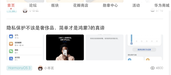 比如,花粉俱樂部一篇名為《隱私保護(hù)不該是奢侈品,簡單才是鴻蒙3的真諦》的帖子,就收獲了近5000次閱讀,大部分網(wǎng)友在評論區(qū)都發(fā)表友好的評論。