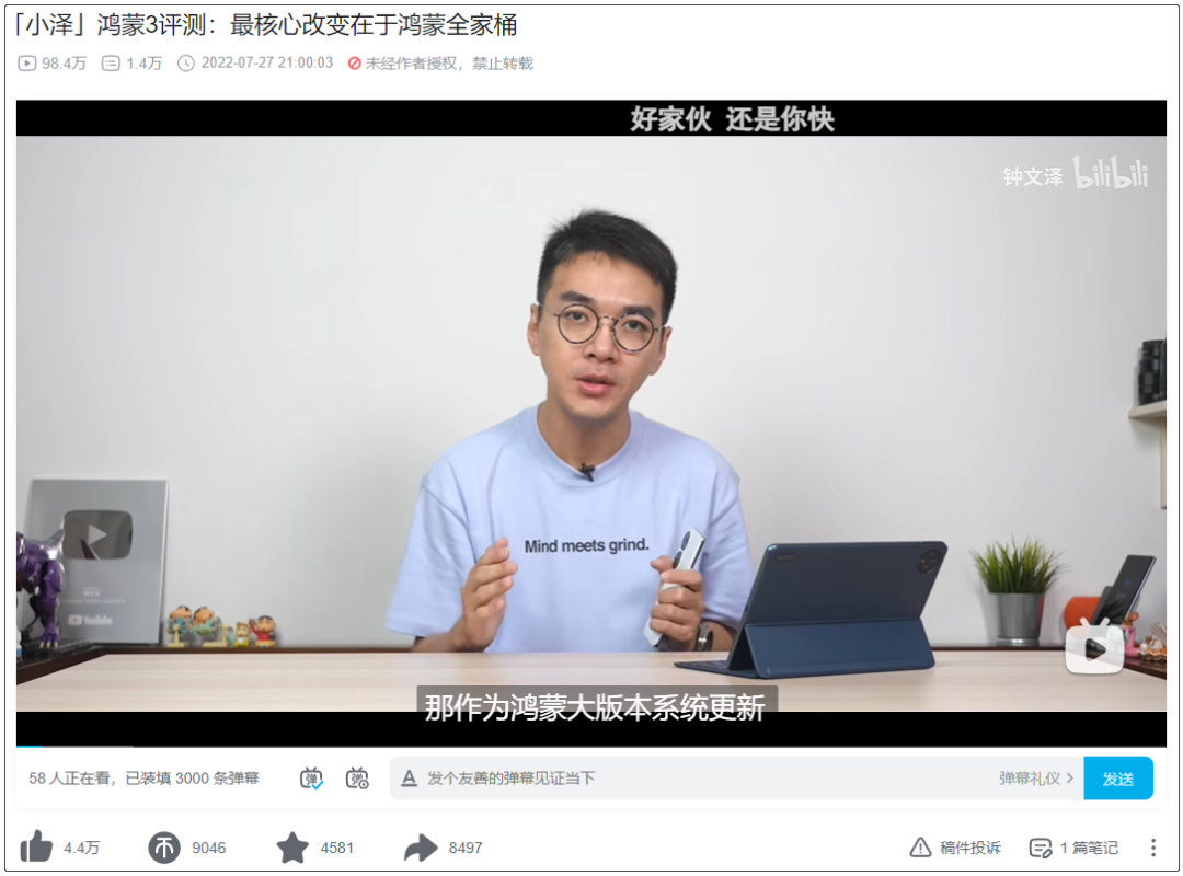 比如,鐘文澤于2022年7月27日產(chǎn)出的鴻蒙3評測,在B站上已收獲近百萬次播放,超5000條評論。評論的主要內(nèi)容,都是在討論鴻蒙以及華為手機(jī)。這在某種程度上,已經(jīng)承載了昔日手機(jī)論壇的絕大部分功能。