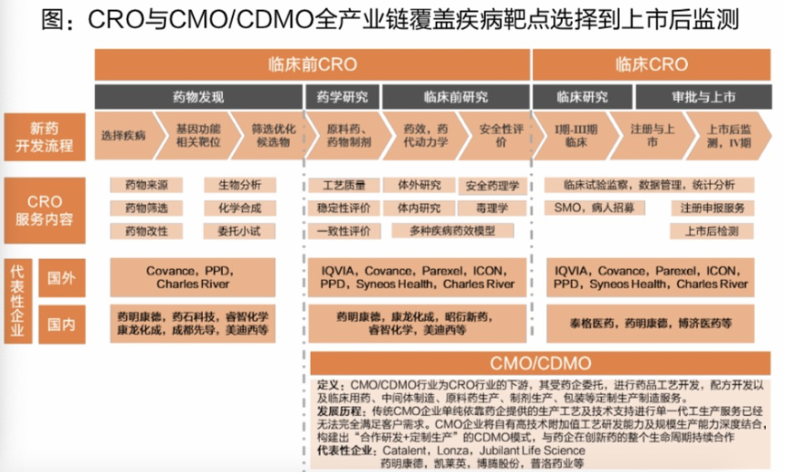 所謂CRO,即通過合同的形式為制藥企業(yè)和研發(fā)機(jī)構(gòu)在藥物研發(fā)過程中提供專業(yè)化服務(wù)的公司和組織,主要為新藥產(chǎn)品發(fā)現(xiàn)、研發(fā)、開發(fā)等臨床前研究及臨床數(shù)據(jù)管理、新藥注冊(cè)申請(qǐng)等專業(yè)技術(shù)服務(wù)支持。它們都是創(chuàng)新藥的蓬勃發(fā)展背景下,為其配套服務(wù)的“賣鏟子”行業(yè)。