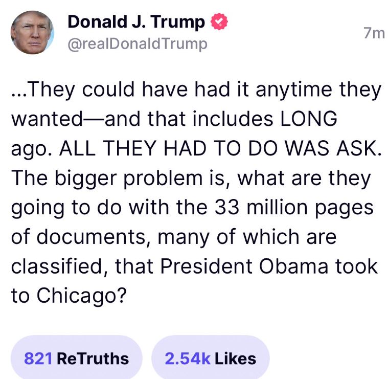 周五,特朗普在自己的社交媒體Truth Social上發(fā)文稱所有文件在他卸任時已經(jīng)解密,司法部不用“扣押”這些文件,隨時都能取走。他還把矛頭對準前總統(tǒng)奧巴馬,稱奧巴馬離任時帶走了3300萬頁文件,很多是機密文件。