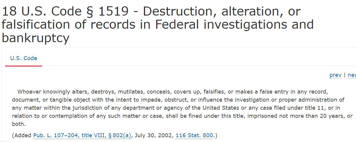第2071條是隱藏、移動或損壞政府記錄;1519條是破壞、修改或者偽造聯(lián)邦調(diào)查記錄和破產(chǎn)記錄,屬于妨礙司法。違反1519條的處罰是罰款或監(jiān)禁不超過20年,或兩者兼施。