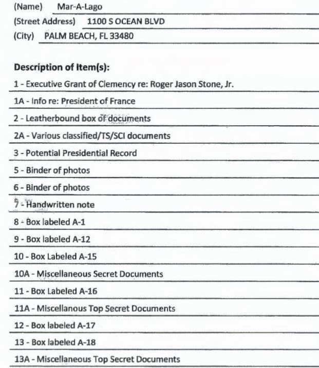 FBI的接收清單顯示,調(diào)查人員從海湖莊園帶走了20多箱文件、照片和筆記。其中一套標為“最高機密/SCI”文件、四套標為“最高機密”文件、三套標為“機密”文件,還有三套標為“保密”文件。