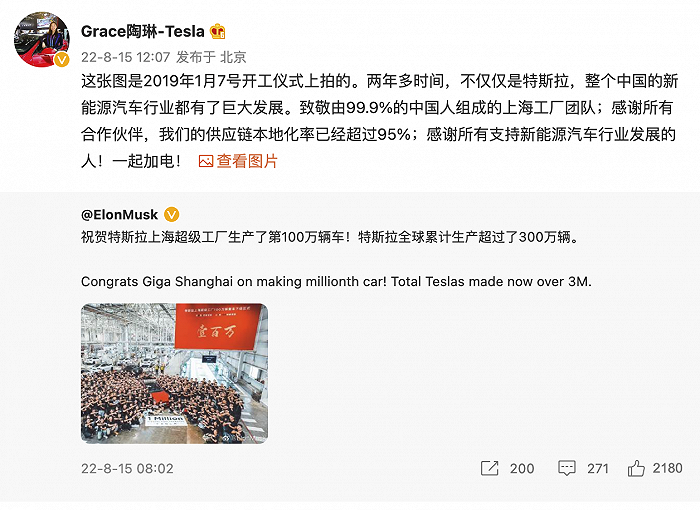 8月15日,特斯拉CEO埃隆·馬斯克微博發(fā)文稱,特斯拉全球累計生產(chǎn)超過300萬輛,其中上海超級工廠生產(chǎn)了100萬輛。當(dāng)日午間,特斯拉對外事務(wù)副總裁陶琳轉(zhuǎn)發(fā)該微博,向上海工廠團(tuán)隊致敬,并透露上海工廠供應(yīng)鏈本地化率已經(jīng)超過95%。