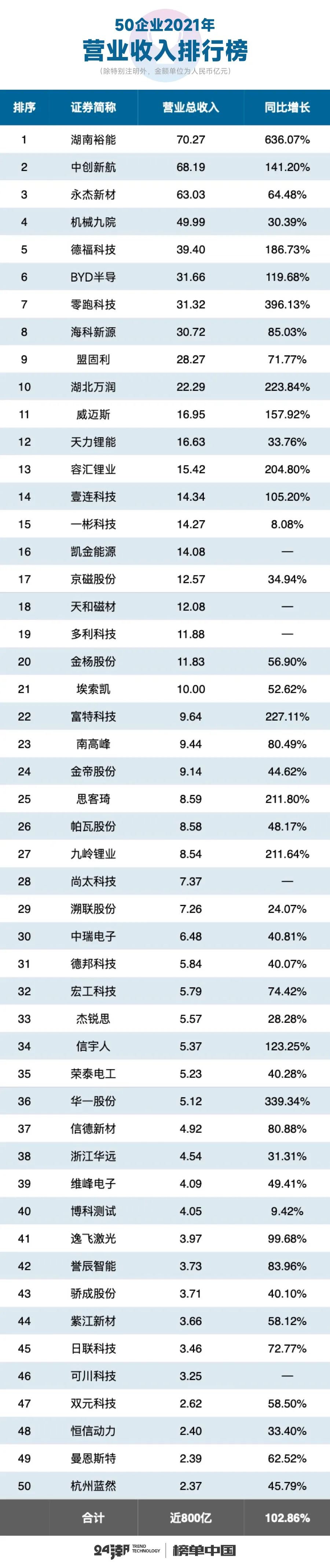 首先在整體營收層面,2021年50家新能源企業(yè)合計(jì)創(chuàng)收近800億元,約同比增長(zhǎng)了102.86%。其中21家企業(yè)營收規(guī)模在10億元以上,15家企業(yè)營收增幅在100%以上,增長(zhǎng)最快的三家企業(yè)依次為湖南裕能-增長(zhǎng)636.07%、零跑科技-增長(zhǎng)396.13%、華一股份-增長(zhǎng)339.34%。