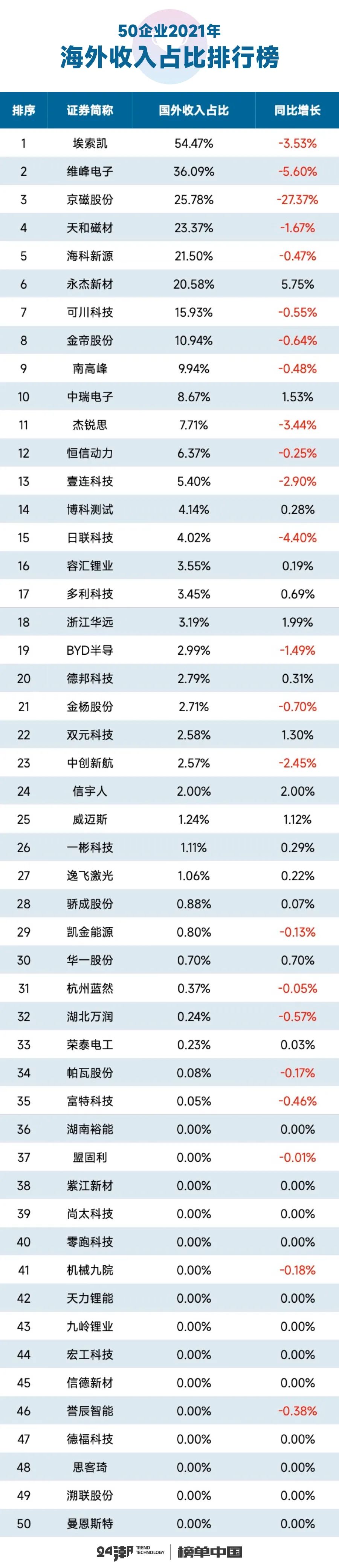 從海外收入占比看,2021年也只有8家企業(yè)海外收入占比在10%以上,另外有15家企業(yè)海外收入及占比為零。