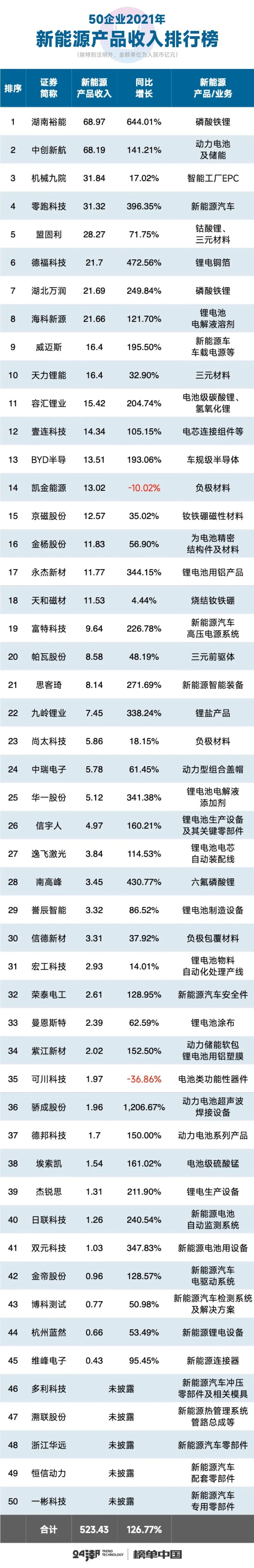 其中,18家企業(yè)的新能源業(yè)務(wù)收入在10億元以上,湖南裕能、中創(chuàng)新航、機(jī)械九院位列前三位,三者主營業(yè)務(wù)/產(chǎn)品分別為磷酸鐵鋰、動(dòng)力電池及儲(chǔ)能、智能工廠EPC。