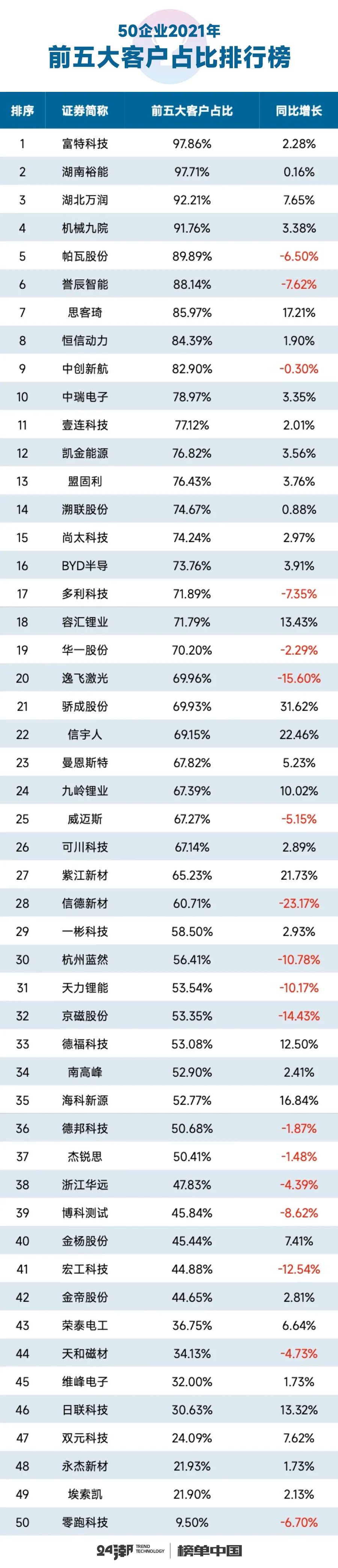24潮統(tǒng)計(jì)數(shù)據(jù)發(fā)現(xiàn),50家新能源企業(yè)中大多數(shù)企業(yè)存在大客戶依賴現(xiàn)象及風(fēng)險(xiǎn)。如下表所示,2021年36家新能源企業(yè)前五大客戶銷售占比在50%以上,其中19家企業(yè)前五大客戶銷售占比在70%以上,前四家企業(yè)銷售占比均在90%以上。