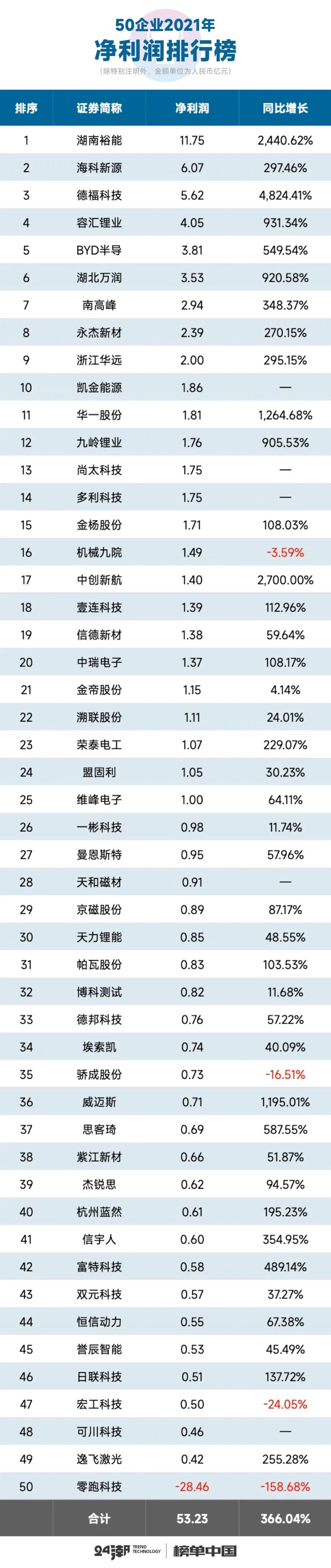 在盈利層面,2021年50家企業(yè)凈利潤(rùn)實(shí)現(xiàn)了更快速的增長(zhǎng)。據(jù)24潮統(tǒng)計(jì),2021年50家企業(yè)整體實(shí)現(xiàn)凈利潤(rùn)53.23億元,同比增長(zhǎng)了366.04%。