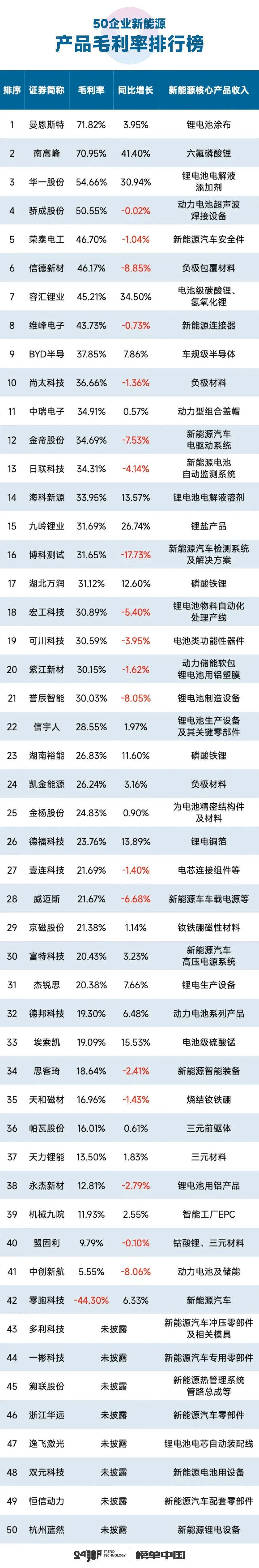 從新能源產(chǎn)品盈利角度看,21家企業(yè)新能源產(chǎn)品毛利率在30%以上,前三名依次為曼恩斯特-毛利率71.82%、南高峰-毛利率41.40%、華一股份-毛利率54.66%,三者新能源主營產(chǎn)品分別為鋰電池涂布、六氟磷酸鋰、鋰電池電解液添加劑。